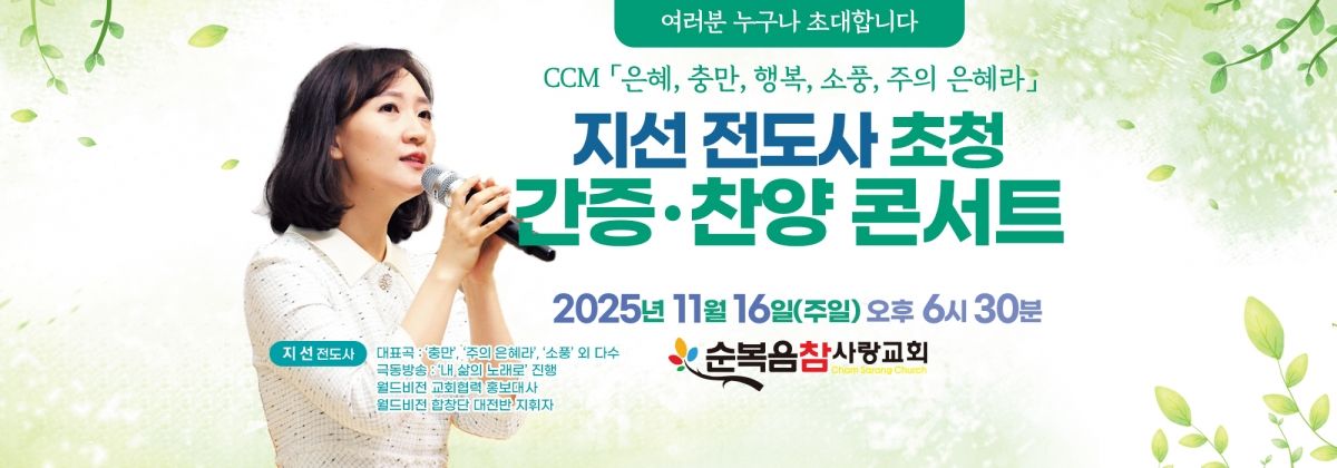 16일 열리는 지선 전도사 초청 찬양간증콘서트는 찬양을 통한 회복과 은혜의 시간을 예고하고 있다. 지선 전도사는 ‘은혜’ ‘충만’ ‘행복’ ‘소풍’ ‘주의 은혜라’ 등으로 사랑받는 찬양사역자로, 진솔한 신앙고백과 따뜻한 목소리로 많은 이들에게 감동을 전해왔다. 그는 이번 집회에서 자신의 삶 속에서 경험한 하나님의 은혜를 간증하고 찬양을 통해 성도들에게 영적 위로와 도전의 메시지를 나눌 예정이다.
