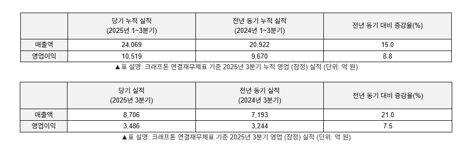 4ÀÏ Å©·¡ÇÁÅæ ±â¾÷¼³¸íȸ(IR) ¹ßÇ¥¿¡ µû¸£¸é ¿ÃÇØ 3ºÐ±â ±âÁØ ÀÌ È¸»ç´Â ¸ÅÃâ 8706¾ï¿ø, ¿µ¾÷ÀÌÀÍ 3486¾ï¿øÀ» ±â·ÏÇß´Ù. °¢°¢ Àü³â µ¿±â¿Í ºñ±³ÇØ 21.0%, 7.5% Áõ°¡ÇÑ ¼öÄ¡´Ù. 2017³â Ãâ½ÃÇØ 9³âÂ÷¸¦ ¸ÂÀº ¹èƲ±×¶ó¿îµå°¡ ¡®½ºÅ׵𠼿·¯¡¯·Î È®½ÇÇÑ Ä³½ÃÄ«¿ì ¿ªÇÒÀ» Çϸç È£½ÇÀûÀ» °ßÀÎÇß´Ù.