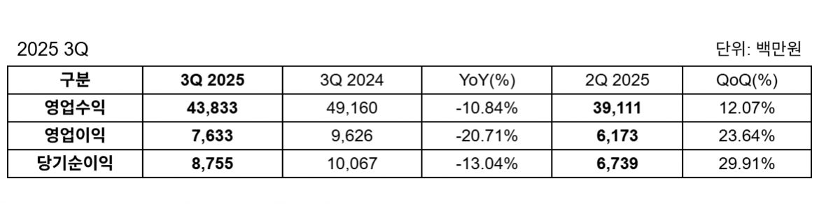 ¸ÅÃâ°ú ¼øÀÌÀÍÀº °¢°¢ 438¾ï¿ø, 87¾ï¿øÀ¸·Î Áý°èµÆ´Ù. °¢°¢ Áö³ÇØ °°Àº ±â°£°ú ºñ±³ÇØ 10.8%, 13.0% ´Ã¾ú´Ù.