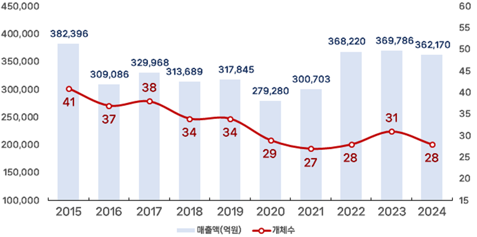 부산기업 전체 매출은 36조 2170억원으로 전년 대비 2.1% 감소했다. 같은 기간 전국 1000대 기업 전체 매출은 5.0% 늘었다. 수도권·대기업 성장 속에서 지역 기업만 역성장한 셈이다.