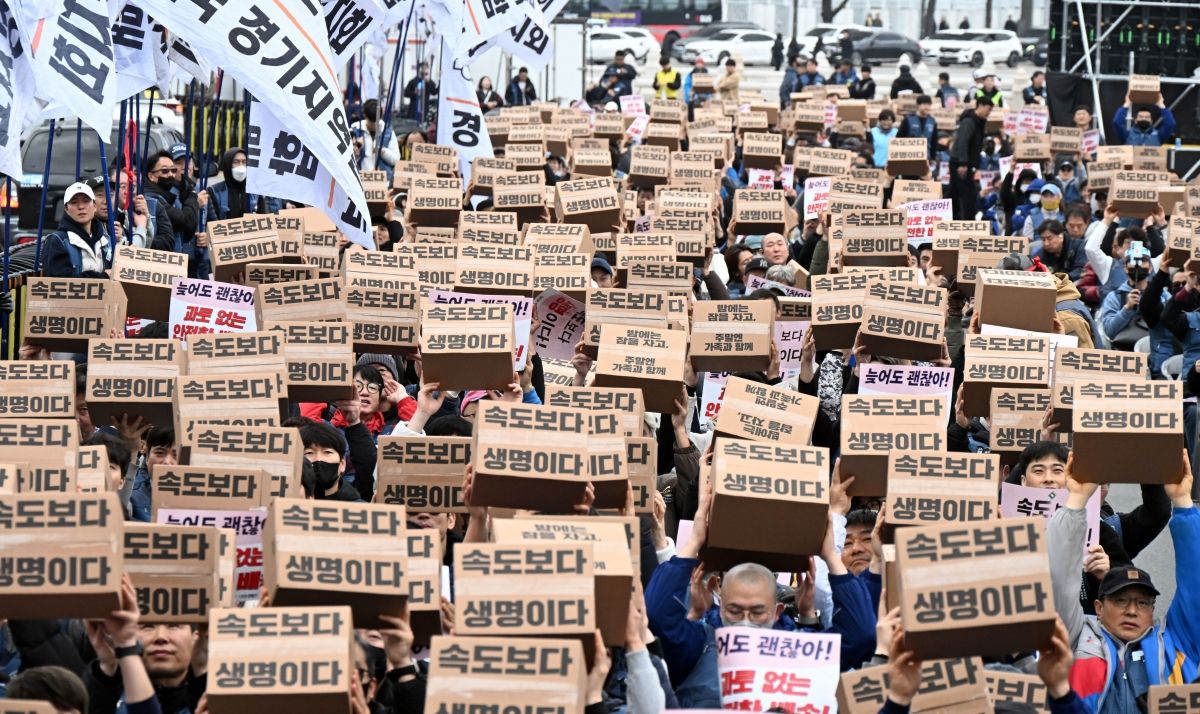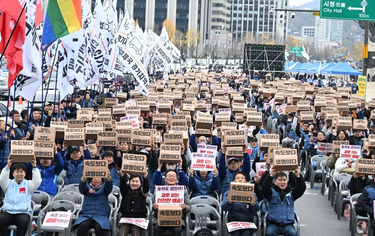 Àü±¹Åùè³ëµ¿Á¶ÇÕ Á¶ÇÕ¿øµéÀÌ 23ÀÏ ¼¿ï Á¾·Î±¸ ±¤È¹® µ¿½ÊÀÚ°¢ ¾Õ¿¡¼ ¿¸° °ú·Î»ç ¾ø´Â ÅÃ¹è ¸¸µé±â ½Ã¹Î´ëÇàÁø¿¡ ¾Õ¼ ÅÃ¹è ³ëµ¿ÀÚÀÇ ½É¾ß³ëµ¿°ú °ú·Î»ç ÇØ°áÀ» Ã˱¸ÇÏ´Â ±¸È£¸¦ ¿ÜÄ¡°í ÀÖ´Ù.