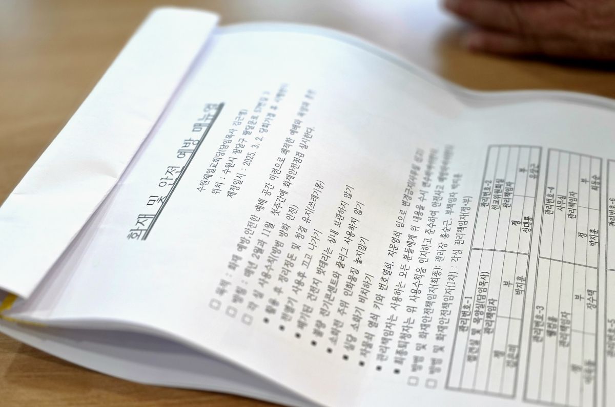 À̳¯ ° Àå·Î¿Í ÀÌ °ü¸®ÀåÀ¸·Î ¿òÁ÷ÀÎ °ü¸®ÆÀÀº Áö³ 3¿ù ´çȸ¿¡¼ °¡°áÇÑ ¡®ÈÀç ¹× ¾ÈÀü ¿¹¹æ ¸Å´º¾ó¡¯À» µû¶ó ¿òÁ÷¿´´Ù. ÀÌ ¸Å´º¾ó¿¡ µû¶ó ±³È¸´Â ¸ñ¾ç½ÇºÎÅÍ °æºñ½Ç±îÁö 57°³ °ø°£¿¡ 2~3¸íÀÇ ¡®¹æ¹ü ¹× ÈÀç ¾ÈÀü °ü¸®Ã¥ÀÓÀÚ¡¯¸¦ ¼¼¿ü´Ù. ±³È¸´Â ¼Ò¹æ±âº»¹ý°ú ¼Ò¹æ½Ã¼³¿¡ °üÇÑ ¹ý·üÀ» Âü°íÇß´Ù.