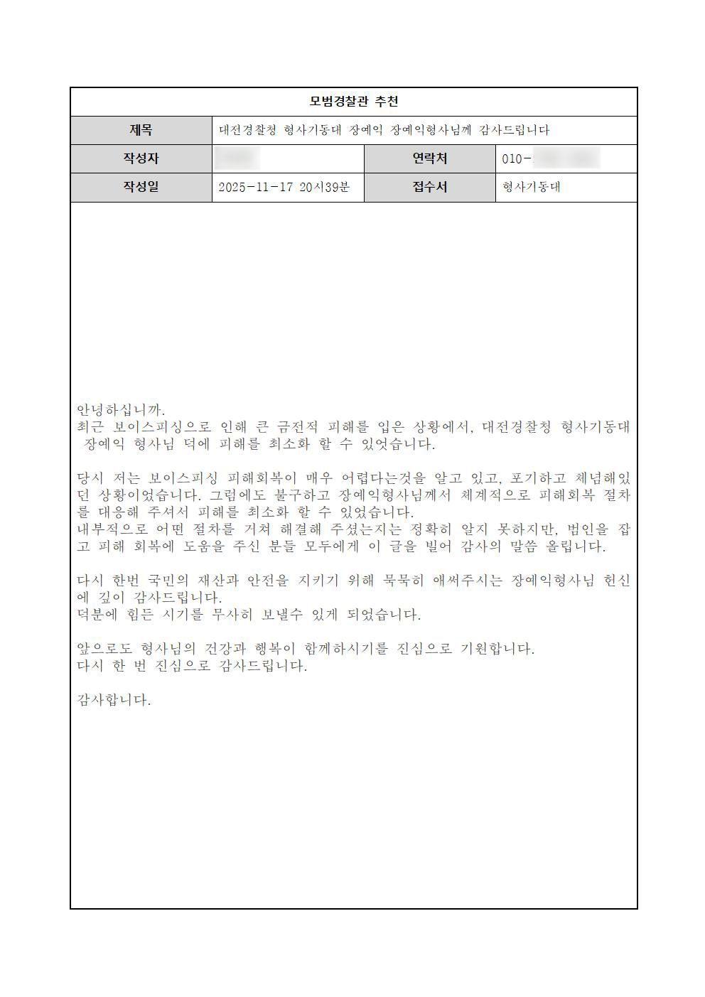 Àå °æÀåÀÇ ²öÁú±ä Ãß°Ý ³¡¿¡ ÇÇÇØ±ÝÀ» µ¹·Á¹ÞÀº A¾¾´Â °¨»çÀÇ ¸¶À½À» ´ã¾Æ ´ëÀüû ȨÆäÀÌÁö¿¡ ¡®¸ð¹ü°æÂû°ü Ãßõ¡¯ ±ÛÀ» ÀÛ¼ºÇß´Ù.