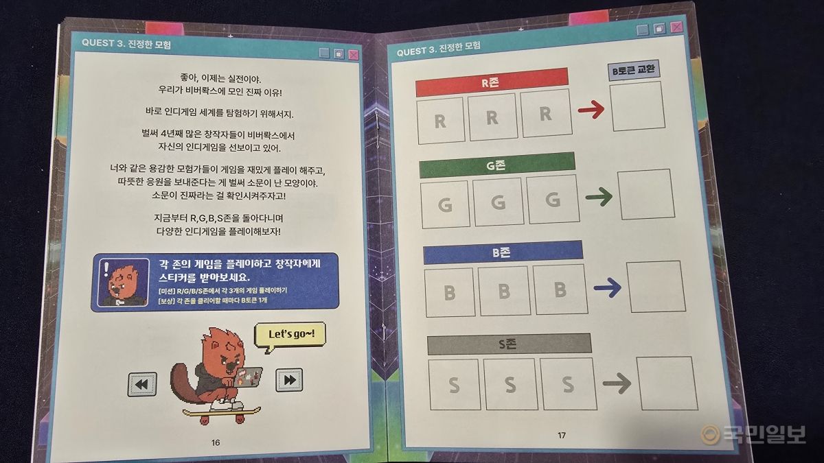 ÇöÀå¿¡¼´Â °ü¶÷°´ Àü¿ø¿¡°Ô ½Ç¹° ¡®°¡À̵å&Äù½ºÆ®ºÏ¡¯ÀÌ Á¦°øµÈ´Ù. Àü½Ã µ¿¼±°ú ¹Ì¼ÇÀ» µû¶ó À̵¿ÇÏ¸ç °¢ °ÔÀÓÀ» üÇèÇÒ ¼ö ÀÖµµ·Ï ¼³°èµÆ´Ù. ÃʽÉÀÚµµ ÀÚ¿¬½º·´°Ô Àεð°ÔÀÓÀ» Áñ±â°í ÀÌÇØÇÏ´Â °æÇèÀ» ÇÒ ¼ö ÀÖ´Ù. ¹Ì¼ÇÀ» ¼öÇàÇÏ¸é ºñ¹ö롹½º¡¤·Î½ºÆ®¾ÆÅ© ±ÂÁ ¹ÞÀ» ¼ö ÀÖ¾î °ü¶÷ ¸ôÀÔµµ¸¦ ³ô¿´´Ù.