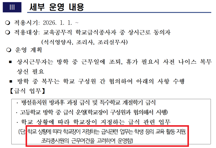 Á¦ÁÖµµ±³À°Ã»ÀÌ Àü±¹ ÃÖÃÊ·Î µµ³» ¸ðµç Çб³ ±Þ½Ä Á¶¸®Á¾»çÀÚ¸¦ ¿¬Áß »ó½Ã±Ù·ÎÀÚ·Î ÀüȯÇßÁö¸¸, ¹æÇÐ ±â°£ ¾÷¹« ¹üÀ§¸¦ ³ëÁ¶¿Í ÇÕÀÇÇÏÁö ¸øÇÑ Ã¤ ½ÃÇàÀ» ¾ÕµÎ¸é¼ Çб³ ÇöÀåÀÇ È¥¶õÀÌ ¿¹»óµÈ´Ù. Á¶¸®Á¾»çÀÚ´Â Ãâ±ÙÇÏÁö¸¸ Á¤ÀÛ ÇлýµéÀº ¿ÜºÎ µµ½Ã¶ôÀ» ¸Ô¾î¾ß ÇÏ´Â ¸ð¼øÀû »óȲÀÌ ¹ß»ýÇÒ °¡´É¼ºÀÌ Å©´Ù.