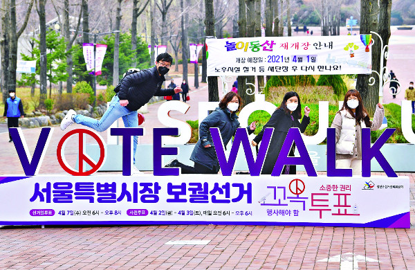 ¼¿ï ±¤Áø±¸¼±°Å°ü¸®À§¿øÈ¸ °ü°èÀÚµéÀÌ 21ÀÏ ¾î¸°ÀÌ´ë°ø¿ø ÈĹ®¿¡¼ ¡®VOTE WALK 縰Áö¡¯¸¦ ½Ã¿¬Çϰí ÀÖ´Ù. Çà»ç´Â ¿À´Â 4¿ù 7ÀÏ ½Ç½ÃµÇ´Â ¼¿ï½ÃÀå º¸±È¼±°Å¿¡¼ À¯±ÇÀÚÀÇ ÅõÇ¥ Âü¿©¸¦ µ¶·ÁÇϱâ À§ÇØ ±âȹµÆ´Ù. ÃÖÇö±Ô ±âÀÚ