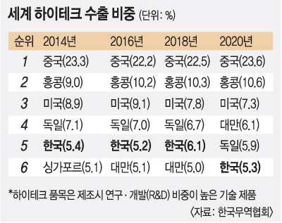 ´ë¸¸Àº ÃÖ±Ù ÇÏÀÌÅ×Å© ǰ¸ñ ¼öÃâ ½ÃÀå¿¡¼ Çѱ¹À» ³Ñ¾î¼¹´Ù. Áö³´Þ Çѱ¹¹«¿ªÇùȸ ±¹Á¦¹«¿ªÅë»ó¿¬±¸¿øÀÌ ¹ß°£ÇÑ ¡®¹Ì¡¤Áß ÇÏÀÌÅ×Å© ¼öÀÔ½ÃÀå¿¡¼ÀÇ Çѱ¹ ¼öÃâ µ¿Çâ ¹× ½Ã»çÁ¡¡¯ º¸°í¼¸¦ º¸¸é 2020³â ±âÁØ ´ë¸¸ÀÇ Àü ¼¼°è ÇÏÀÌÅ×Å© ¼öÃâ ºñÁßÀº 6.1%·Î, 5.3%ÀÎ Çѱ¹À» ¾ÕÁú·¶´Ù. ¼¼°è ÃÖ´ë ÆÄ¿îµå¸®(¹ÝµµÃ¼ À§Å¹»ý»ê) ¾÷üÀÎ TSMC¸¦ ¾Õ¼¼¿î ½ÇÀûÀÌ´Ù.