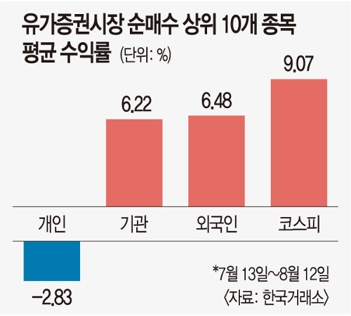 ¹Ý¸é ¿Ü±¹Àΰú ±â°ü ÅõÀÚÀÚ°¡ ¼ø¸Å¼öÇÑ Á¾¸ñµéÀº ´ëü·Î ¼öÀÍÀ» ³Â´Ù. ¿Ü±¹ÀÎ ¼ø¸Å¼ö »óÀ§ 10°³ Á¾¸ñ Áß ¼öÀÍ·üÀÌ ¸¶À̳ʽºÀÎ Á¾¸ñÀº ´Ü 2°³¿´°í ±â°üÀº 1°³»ÓÀ̾ú´Ù. À̵é Á¾¸ñ¿¡¼ ¿Ü±¹ÀÎÀÇ Æò±Õ ¼öÀÍ·üÀº 6.48%, ±â°ü ÅõÀÚÀÚ´Â 6.22%·Î ³ªÅ¸³µ´Ù.