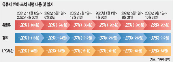 28ÀÏ ±âȹÀçÁ¤ºÎ¿¡ µû¸£¸é Á¤ºÎ´Â 10¿ù Áß ÇöÇà À¯·ù¼¼ ÀÎÇÏ Á¶Ä¡ ¿¬Àå ¿©ºÎ¸¦ ¶Ç ÇÑ ¹ø °áÁ¤ÇÒ ¿¹Á¤ÀÌ´Ù. 2021³â 11¿ùºÎÅÍ ½ÃÇàµÈ ÀÎÇÏ Á¶Ä¡´Â Àϸô ¶§¸¶´Ù ¿¬ÀåÀÌ °áÁ¤µÅ ½ÃÇà ±â°£ÀÌ ¿À´Â 10¿ù 31ÀϱîÁö ´Ã¾î³ »óÅ´Ù. ÇöÀç ÈÖ¹ßÀ¯¿¡´Â 25%ÀÇ ÀÎÇÏÀ²ÀÌ Àû¿ëµÅ §¤´ç 205¿øÀÇ ¼¼ ºÎ´ãÀÌ °æ°¨µÇ°í ÀÖ´Ù. °æÀ¯¡¤¾×ȼ®À¯°¡½º(LPG)¿¡ Àû¿ëµÇ´Â ÀÎÇÏÀ²Àº 37%·Î °¢°¢ §¤´ç 212¿ø, 73¿øÀÇ ¼¼±ÝÀÌ ÁÙ¾îµç´Ù.