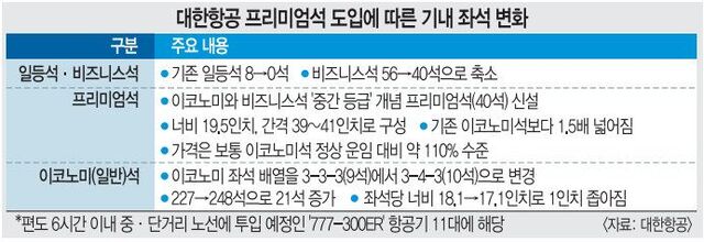 19ÀÏ Ç×°ø¾÷°è¿¡ µû¸£¸é ´ëÇÑÇ×°øÀº ´ÙÀ½ ´ÞºÎÅÍ º¸À× 777-300ER 11´ë¸¦ °³Á¶ÇØ ÇÁ¸®¹Ì¾ö¼®À» µµÀÔÇÑ´Ù. »õ·Î ¼±º¸ÀÌ´Â ÇÁ¸®¹Ì¾ö¼®Àº ºñÁî´Ï½º¼®(ÇÁ·¹½ºÆ¼Áö¼®)°ú ÀÌÄÚ³ë¹Ì¼®ÀÇ Áß°£ µî±Þ °³³äÀÌ´Ù. ³Êºñ 19.5ÀÎÄ¡, °£°Ý 39~41ÀÎÄ¡·Î ±âÁ¸ ÀÌÄÚ³ë¹Ì¼® ´ëºñ ¾à 1.5¹è ³ÐÀº °ø°£À» Á¦°øÇÑ´Ù. °¡°ÝÀº ÀÌÄÚ³ë¹Ì¼® Á¤»ó ¿îÀÓ ´ëºñ ¾à 10% ³ô°Ô Ã¥Á¤µÉ ¿¹Á¤ÀÌ´Ù. µ·À» ´õ ³»°í¼¶óµµ Æí¾ÈÇÔÀ» ¿øÇÏ´Â Áß°£ ¼ö¿äÃþÀ» °Ü³ÉÇÑ °ÍÀÌ´Ù. ÀÌ °úÁ¤¿¡¼ ÀϵÀº »ç¶óÁö°í, ºñÁî´Ï½º¼®Àº ÀϺΠÁÙ¾îµå´Â ´ë½Å ÇÁ¸®¹Ì¾ö¼®°ú ÀÌÄÚ³ë¹Ì¼®À¸·Î ÀçÆíµÈ´Ù. Àüü Á¼® ¼ö´Â 291¼®¿¡¼ 328¼®À¸·Î ´Ã¾î³´Ù.