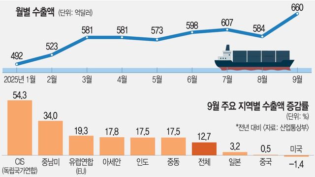 9¿ù ¼öÃâÀÌ Áö³Çغ¸´Ù ¾à 13% ´Ã¸ç 3³â6°³¿ù ¸¸¿¡ ÃÖ°í ½ÇÀûÀ» ±â·ÏÇß´Ù. ¹Ì±¹ÀÇ °ü¼¼ ¾Ð¹Ú¿¡µµ ¾Æ½Ã¾Æ¿Í À¯·´ µîÀ¸·ÎÀÇ ¼öÃâ ½ÃÀå ´Ùº¯È Àü·«ÀÌ È¿°ú¸¦ ³½ ´öºÐÀÌ´Ù. ƯÈ÷ ¹ÝµµÃ¼´Â ¿ª´ë ÃÖ°í ½ÇÀûÀ» °æ½ÅÇϸç Àüü ¼öÃâÀ» À̲ø¾ú°í ÀÚµ¿Â÷ ¼öÃâµµ 9¿ù ±âÁØ »ç»ó ÃÖ´ë ±Ô¸ð¸¦ ´Þ¼ºÇß´Ù.