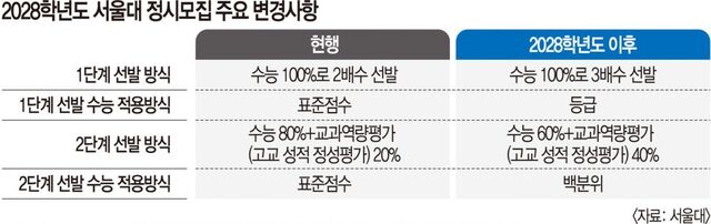 2일 교육계와 입시 업계에서는 서울대가 지난달 29일 발표한 ‘2028학년도 대학 신입학생 입학전형 주요 사항’에서 수능 영향력을 줄였다는 평가가 나온다.