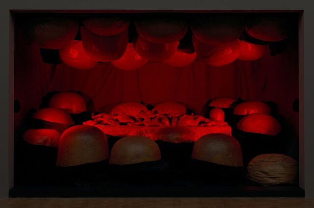 À̸¦ ±Ø¸íÈ÷ º¸¿©ÁÖ´Â ÀÛǰÀÌ ¡®¾Æ¹öÁöÀÇ ÆÄ±«¡¯(1974)´Ù. ¡°¾î¸° ½ÃÀý ½ÄŹ¿¡¼ ¾Æ¹öÁöÀÇ Àڱ⠰ú½Ã¿¡ ÁöÄ£ °¡Á·µéÀÌ ±×¸¦ ²ø¾î³»·Á »çÁö¸¦ Âõ°í ¸Ô¾îÄ¡¿ì´Â »ó»óÀ» Çß´Ù¡±°í ½ÇÅäÇÑ ±×¿´´Ù. ¾Æ¹öÁö¸¦ °í±â Àý´ÜÇÏµí ºÓÀº Á¶¸íÀÇ Á¤À°Á¡ ºÐÀ§±â ¼³Ä¡ ÀÛ¾÷À¸·Î ÀçÇöÇÑ ¿ë°¨ÇÔÀ̶ó´Ï. ÀÌ¹Ì ³²±Ù ¼þ¹è »ç»ó¿¡ ¹Ý±â¸¦ µé¸ç ³²±Ù ¸ð¾ç ¿©¼º Á¶°¢(1968)À» ¸¸µé Á¤µµ·Î ±×´Â °ú°¨Çß´Ù. ¡®¾Æ¹öÁöÀÇ ÆÄ±«¡¯´Â 90³â´ë ¡®¹Ð½Ç¡¯ ¿¬ÀÛÀÇ ¼³Ä¡ ÀÛ¾÷À¸·Î È®´ëµÆ´Âµ¥ ºÎ¸ð ¹æÀ» ¿³º¸´Â ¾ÆÀÌÀÇ ºÒ¾ÈÇÑ ½É¸®¸¦ ´ã¾Æ³½ ¡®ºÓÀº ¹æ¡¯(1994)¿¡¼µµ °¡Á·»ç°¡ ÀÐÈù´Ù.