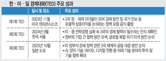 ¹Ì±¹¹ß °ü¼¼ ¾Ð¹Ú°ú ¹Ì¡¤Áß ¹«¿ª °¥µîÀ¸·Î ´ë¿Ü ºÒÈ®½Ç¼ºÀÌ Ä¿Áø »óȲ¿¡¼ ±¹³» ÁÖ¿ä ±×·ì ÃѼöµéÀÌ 15ÀÏ ÀϺ» µµÄì¿¡¼ ¿¸° ¡®ÇÑ¡¤¹Ì¡¤ÀÏ °æÁ¦´ëÈ¡¯(TED)¿¡ Âü¼®ÇØ À§±â ±Øº¹ ¹æ¾ÈÀ» ¸ð»öÇß´Ù. TED´Â ÇÑ¡¤¹Ì¡¤ÀÏ 3±¹ Çù·ÂÀÇ »õ·Î¿î ÀåÀ» ¿¬ °ÍÀ¸·Î Æò°¡¹Þ´Â 2023³â 8¿ù ¹Ì Ä·ÇÁµ¥À̺ñµå Á¤»óȸÀÇÀÇ ºÐÀ§±â¸¦ ÀÌ¾î ¹Þ¾Æ ¹Î°£ ÁÖµµ·Î Ãâ¹üÇÑ ÇùÀÇü´Ù. À̹ø ȸÀÇ¿¡¼± ±Û·Î¹ú °ø±Þ¸Á ÀçÆí, ÷´Ü±â¼ú °æÀï, Åë»ó ¸®½ºÅ© µî º¹ÇÕ À§±â¿¡ °øµ¿ ´ëÀÀÇÏ´Â 3±¹ Â÷¿øÀÇ Çù·Â ¹æ¾ÈÀÌ ÇÙ½É ÀÇÁ¦·Î ´Ù·ïÁø °ÍÀ¸·Î ¾Ë·ÁÁ³´Ù. Çѱ¹ °æÁ¦°è ÀÔÀå¿¡¼± 3±¹ Á¤ºÎ¡¤ÀÇȸ¿ÍÀÇ ¼ÒÅëÀ» ÅëÇØ °æ¿µ¿¡ ¿µÇâÀ» ¹ÌÄ¡´Â Á¤Ã¥ º¯È¿¡ ÀǰßÀ» °³ÁøÇϰí ÀÌÇØ°ü°è¸¦ Á¶À²ÇÏ´Â ±âȸ·Î »ïÀ» ¼ö ÀÖ´Ù.