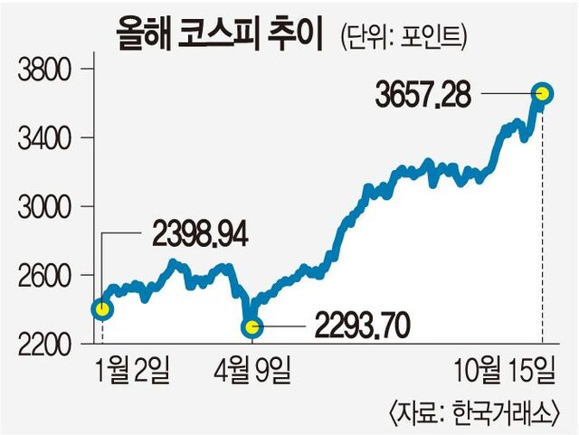 Çѱ¹°Å·¡¼Ò¿¡ µû¸£¸é À̳¯ ÄÚ½ºÇÇ´Â Àü °Å·¡ÀϺ¸´Ù 95.47Æ÷ÀÎÆ®(2.68%) ±ÞµîÇÑ 3657.28¿¡ °Å·¡¸¦ ¸¶Ä¡¸ç »ç»ó ÃÖ°í ±â·ÏÀ» ´Ù½Ã ½è´Ù. Áö³ 10ÀÏ Ã³À½À¸·Î 3600¼±À» ³ÑÀº µÚ 3ÀÏ ¸¸¿¡ Àü°íÁ¡À» ³Ñ¾î¼¹´Ù. ÄÚ½ºÇÇ Àüü ½Ã°¡ÃѾ׵µ 3011Á¶9081¾ï¿øÀ» ±â·ÏÇØ óÀ½À¸·Î 3000Á¶¿øÀ» ³Ñ°å´Ù.