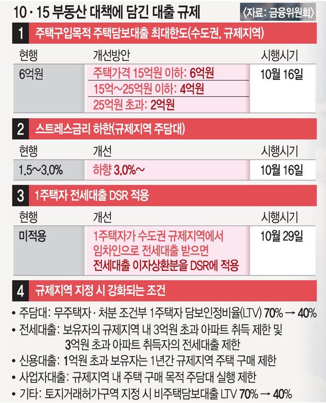 »õ·Ó°Ô ±ÔÁ¦Áö¿ªÀÌ µÈ ¼­¿ï ÀÚÄ¡±¸ 21°÷°ú °æ±â Áö¿ª 12°÷¿¡´Â °­È­ÇÑ ´ëÃâ ±ÔÁ¦°¡ Áï½Ã Àû¿ëµÈ´Ù. ¹«ÁÖÅÃÀÚ¿Í Ã³ºÐ Á¶°ÇºÎ 1ÁÖÅÃÀÚ°¡ ¹Þ´Â ÁÖ´ã´ëÀÇ LTV´Â 70%¿¡¼­ 40%·Î Ãà¼ÒµÈ´Ù. Àü¼¼´ëÃâ º¸À¯ÀÚ´Â ±ÔÁ¦Áö¿ª ³» 3¾ï¿ø Ãʰú ¾ÆÆÄÆ® ±¸¸Å°¡ ºÒ°¡´ÉÇØÁø´Ù. ±ÔÁ¦Áö¿ª ³» 3¾ï¿ø Ãʰú ¾ÆÆÄÆ® º¸À¯ÀÚµµ Àü¼¼´ëÃâÀ» ¹ÞÀ» ¼ö ¾ø´Ù. ÅäÁö°Å·¡Çã°¡±¸¿ª ³» »ó°¡¿Í ¿ÀÇǽºÅÚ µî ºñÁÖÅÃÀÇ ´ãº¸´ëÃâ LTVµµ 70%¿¡¼­ 40%·Î ³»·Á°£´Ù.