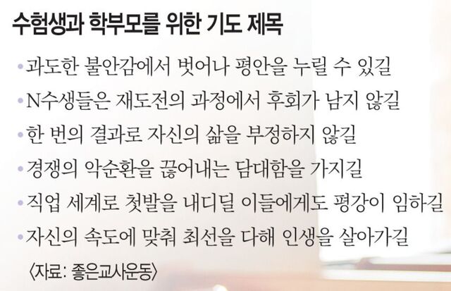 ´ëÇмöÇдɷ½ÃÇè(¼ö´É)À» 4ÁÖ ¾ÕµÎ°í ¼öÇè»ýÀ» À§ÇÑ ±âµµ°¡ À̾îÁö°í ÀÖ´Ù. ±³È¸¿Í ¼ºµµµéÀº ¡®±âÀû °°Àº ¼ºÀû Çâ»óÀ̳ª Çհݸ¸ ¹Ù¶ó´Â ±âº¹ ½Å¾Ó¡¯À» °æ°èÇϰí, Çϳª´ÔÀÇ °èȹÀ» ½Å·ÚÇÒ ¼ö ÀÖµµ·Ï ¸¶À½À» ¸ðÀ¸´Â ÁßÀÌ´Ù. °°Àº ½Ã±â ¼öÇè»ý»Ó ¾Æ´Ï¶ó ¸ðµç ÀÚ³àÀÇ ¹Ì·¡¸¦ ³õ°í ±âµµÇÏ´Â ±³È¸µéµµ ÀûÁö ¾Ê´Ù.