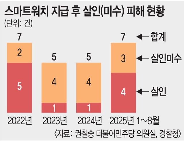 ½º¸¶Æ®¿öÄ¡¸¦ ÅëÇÑ ½Åº¯º¸È£ À§Ä¡È®ÀνýºÅÛÀº 2022³â 1¿ùºÎÅÍ Á¤½Ä ¿î¿µµÆ´Ù. »ìÀΰú »ìÀι̼ö »ç°ÇÀº 2022³â 7°ÇÀ» ±â·ÏÇÑ ÀÌÈÄ 2023³â 5°Ç, 2024³â 5°Ç ¹ß»ýÇß´Ù. ¿ÃÇØ´Â Áö³ 8¿ù±îÁö 7°ÇÀ¸·Î Áý°èµÆ´Ù. ½º¸¶Æ®¿öÄ¡´Â ÇÇÇØÀÚ°¡ À§±ÞÇÑ ¼ø°£ ¹öưÀ» ´·¯ À§Ä¡¸¦ Àü¼ÛÇÏ´Â ¹æ½ÄÀ̶ó´Â Á¡¿¡¼ Áï°¢ÀûÀÎ ¹üÇàÀ» ¸·±â ¾î·Æ´Ù´Â ÇѰ谡 ÀÖ´Ù. ¾Õ¼± »ç·Ê¿¡¼µµ A¾¾°¡ ½º¸¶Æ®¿öÄ¡ ¹öưÀ» ´·¯ °æÂûÀÌ ¾à 3ºÐ ¸¸¿¡ ÇöÀå¿¡ µµÂøÇßÁö¸¸ ¹üÇàÀ» ¸·Áö ¸øÇÑ °ÍÀ¸·Î ÆÄ¾ÇµÆ´Ù.