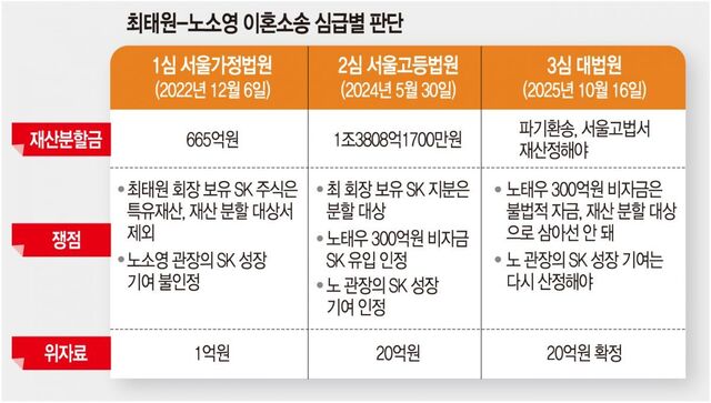 ¡®¼¼±âÀÇ ÀÌÈ¥¡¯À¸·Î ºÒ¸®´Â ÃÖÅ¿ø SK±×·ì ȸÀå°ú ³ë¼Ò¿µ ¾ÆÆ®¼¾ÅÍ ³ªºñ °üÀåÀÇ ÀÌÈ¥¼Ò¼Û »ó°í½É¿¡¼ ¾à 1Á¶3808¾ï¿øÀ» ³ë °üÀå ¸òÀÇ Àç»êºÐÇÒ¾×À¸·Î ÆÇ´ÜÇÑ 2½É ÆÇ°áÀÌ ÆÄ±âµÆ´Ù. ÇÙ½É ÀïÁ¡À̾ú´ø ³ëÅ¿ì Àü ´ëÅë·ÉÀÇ ºñÀÚ±Ý 300¾ï¿øÀ» ´ë¹ý¿øÀº ³ë °üÀåÀÇ ºÎºÎ °øµ¿Àç»ê ±â¿©ºÐÀ¸·Î ÀÎÁ¤ÇÏÁö ¾ÊÀº °ÍÀÌ´Ù. ´Ù¸¸ 1½É¿¡¼ ¹èÁ¦µÆ´ø ÃÖ È¸ÀåÀÇ SK¢ß ÁöºÐ ÀÚü´Â ºÎºÎ °øµ¿Àç»êÀ¸·Î ºÃ´Ù. ÀÌ¿¡ µû¶ó ÇâÈÄ ÆÄ±âȯ¼Û½ÉÀ» °ÅÄ£ ÃÖÁ¾ Àç»êºÐÇÒ¾×Àº 1½É(665¾ï¿ø)º¸´Ù´Â ¸¹°í 2½Éº¸´Ù´Â ÀûÀº ¹üÀ§¿¡¼ Á¤ÇØÁú °ÍÀ¸·Î Àü¸ÁµÈ´Ù.