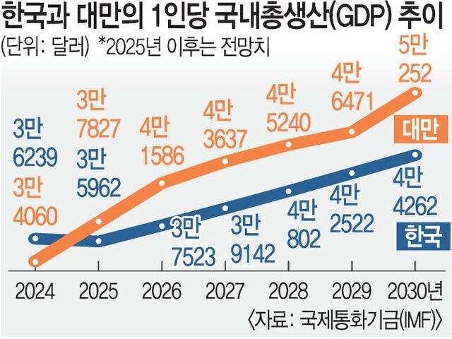 ¹Ý´ë·Î ´ë¸¸Àº ¿ÃÇØ 1Àδç GDP°¡ 3¸¸7827´Þ·¯·Î Áö³ÇØ(3¸¸4060´Þ·¯) ´ëºñ 3767´Þ·¯(11.1%) Áõ°¡ÇØ 38À§¿¡¼ 35À§·Î ¿À¸¦ °ÍÀ¸·Î ¿¹»óµÈ´Ù. ÀÌ ¿¹Ãø´ë·Î¶ó¸é 2003³â Çѱ¹(1¸¸5211´Þ·¯)ÀÌ ´ë¸¸(1¸¸4040´Þ·¯)¿¡ ¾Õ¼±â ½ÃÀÛÇÑ µÚ 22³â ¸¸¿¡ µÎ ³ª¶ó ¼øÀ§°¡ ´Ù½Ã ¹Ù²î°Ô µÈ´Ù. ´ë¸¸Àº ³»³â 4¸¸1586´Þ·¯¸¦ ±â·ÏÇØ Çѱ¹º¸´Ù 2³â ¸ÕÀú 4¸¸ ´Þ·¯ ¼±À» µ¹ÆÄÇÑ µÚ °í¼Ó ¼ºÀå¼¼¸¦ À¯ÁöÇØ 5³â µÚÀÎ 2030³â(5¸¸252´Þ·¯)À̸é 5¸¸ ´Þ·¯µµ ³Ñ±æ °ÍÀ¸·Î º¸ÀδÙ. °°Àº ÇØ Çѱ¹Àº 4¸¸4262´Þ·¯·Î ´ë¸¸º¸´Ù 6000´Þ·¯ °¡±îÀÌ ³·´Ù.