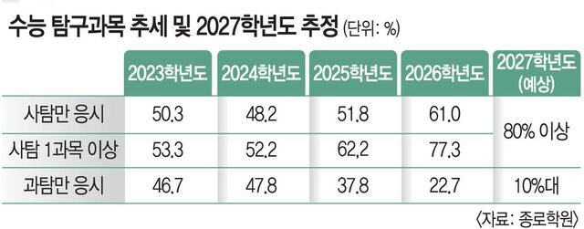 ¿À´Â 11¿ù 13ÀÏ Ä¡·¯Áö´Â 2026Çг⵵ ¼ö´É¿¡ ÀÀ½Ã¿ø¼¸¦ ³½ ¼öÇè»ýÀº ¸ðµÎ 55¸¸4174¸íÀÌ´Ù. ÀÌ Áß »çŽ °ú¸ñ¸¸ ¼±ÅÃÇÑ ¼öÇè»ýÀº 32¸¸4405¸í(61%), °úޏ¸ ¼±ÅÃÇÑ ÀοøÀº 12¸¸692¸í(22.7%)À̾ú´Ù. »çްú °úŽÀ» ÇÑ °ú¸ñ¾¿ ¼±ÅÃÇÑ ÀοøÀº 8¸¸6854¸í(16.3%)À¸·Î ³ªÅ¸³µ´Ù. »çޏ¸ ¼±ÅÃÇÑ ÀοøÀÌ °úޏ¸ ¼±ÅÃÇÑ Àοøº¸´Ù 2.7¹è ¸¹¾ÆÁø °ÍÀÌ´Ù. »çŽÀ» ÇÑ °ú¸ñ ÀÌ»ó ¼±ÅÃÇÑ ºñÀ²ÀÌ ¹«·Á 77.3%¿¡ ´ÞÇß´Ù.