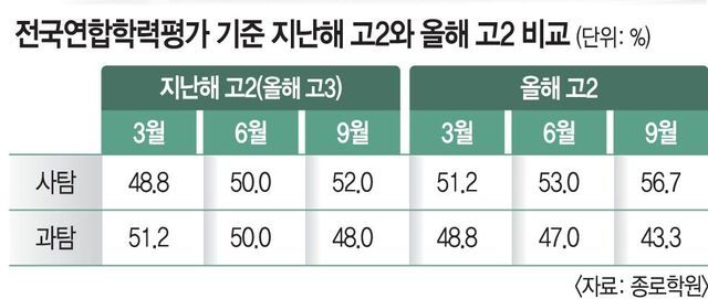 ÇöÀç °í2°¡ Áö³ 3¿ù ÇÐÆò¿¡¼ °úŽÀ» ¼±ÅÃÇÑ ºñÀ²Àº 48.8%¿´´Ù. 6¿ù ÇÐÆò¿¡¼ 47%·Î ³·¾ÆÁ³°í 9¿ù ÇÐÆò¿¡¼± 43.3%·Î ´õ ¶³¾îÁ³´Ù. Áö³ÇØ °í2(¿ÃÇØ °í3)º¸´Ù °úŽÀ» ¼±ÅÃÇÏ´Â ºñÀ²ÀÌ 2.4~4.7% Æ÷ÀÎÆ® ´õ ³·Àº °ÍÀÌ´Ù. À̸¦ ¿ÃÇØ °í3ÀÇ °úŽ ÀÌÅ» È帧¿¡ ´ëÀÔÇÏ¸é ¿ÃÇØ °í2°¡ ¼ö´É¿¡¼ °úŽ µÎ °ú¸ñÀ» ¼±ÅÃÇÏ´Â ºñÀ²Àº 20%¸¦ ¹Øµ¹ ¼ö ÀÖ´Ù. ƯÈ÷ °úŽ ¼±Åðú¸ñ °¡¿îµ¥ ÀÀ½ÃÀÚ°¡ Çö°ÝÈ÷ ÀûÀº °ú¸ñÀ» Áغñ ÁßÀÎ ¼öÇè»ýÀÇ ºÒ¾È°¨ÀÌ Ä¿Áú ¼ö ÀÖ´Ù.