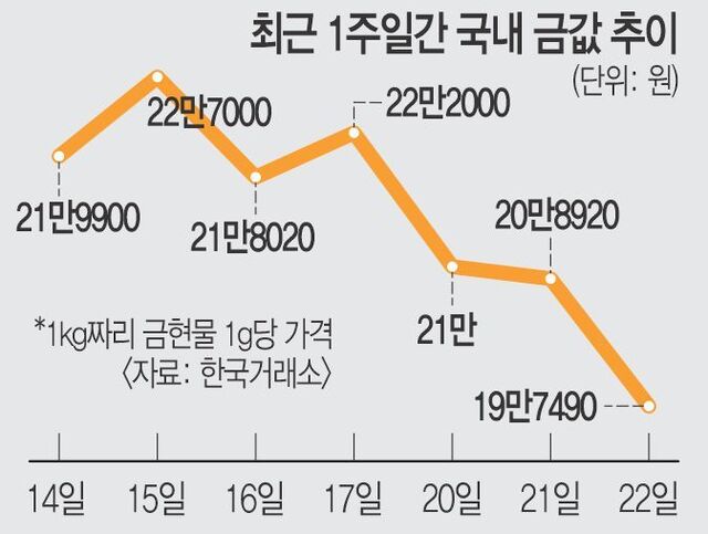 ±¹³» ±Ý°ªÀº ±èÄ¡ ÇÁ¸®¹Ì¾öÀÌ ºüÁö¸é¼ ±¹Á¦ °¡°Ýº¸´Ù ´õ ºü¸£°Ô Á¶Á¤À» ¹Þ°í ÀÖ´Ù. KRX ±Ý Çö¹° ½ÃÀå¿¡¼ ±Ý °¡°ÝÀº Áö³ 20ÀÏ Àü °Å·¡ÀϺ¸´Ù 5.41% ¶³¾îÁø µÚ 21ÀÏ(-0.51%)¿¡ À̾î À̳¯±îÁö 3°Å·¡ÀÏ ¿¬¼Ó Ç϶ôÇß´Ù. Áö³ 15ÀÏ ÀÌ´Þ ÃÖ°í °¡°Ý(22¸¸7000¿ø)°ú ºñ±³Çϸé 13% Ç϶ôÇß´Ù. ±¹Á¦ ±Ý°ªÀÌ ÀÌ´Þ ÃÖ°íÄ¡ ´ëºñ 5%°¡·® Ç϶ô ÁßÀÎ °Í°ú ºñ±³ÇÏ¸é ³«ÆøÀÌ Å©´Ù.
