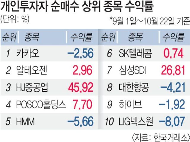 Çѱ¹°Å·¡¼Ò¿¡ µû¸£¸é Áö³´ÞºÎÅÍ À̳¯(9¿ù 1ÀÏ~10¿ù 22ÀÏ)±îÁö °³ÀÎ ÅõÀÚÀÚ ¼ø¸Å¼ö »óÀ§ 10°³ Á¾¸ñ °¡¿îµ¥ Àý¹ÝÀÌ ¼Õ½Ç ÁßÀÌ´Ù. °°Àº ±â°£ ÄÚ½ºÇÇ´Â 22% ³Ñ°Ô ¿Ã¶úÁö¸¸ ½ÃÀå ¼öÀÍ·üÀ» À̱ä Á¾¸ñÀº 2°³¿¡ ±×ÃÆ´Ù. ÄÚ½ºÇÇ »ó½ÂÀ» ÁÖµµÇÏ´Â ¹ÝµµÃ¼³ª ¹ÝµµÃ¼ ÀåºñÁÖ¸¦ °èÁ¿¡ ´ãÁö ¾Ê°í ´ë½Å ½ÃÀå¿¡¼ Å« °ü½ÉÀ» ¹ÞÁö ¸øÇÏ´Â Åë½ÅÁÖ³ª ÄÚ½º´Ú ¹ÙÀÌ¿À µîÀ» ´ãÀº °ÍÀÌ ÆÐÂøÀ¸·Î ºÐ¼®µÈ´Ù.