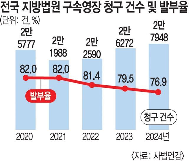 22ÀÏ ¹ýÁ¶°è¿¡ µû¸£¸é ±è â¾÷ÀÚ »ç°Çó·³ ¹ý¿øÀÌ °ËÂûÀÇ °úÀ× ¼ö»ç¿¡ ¾ö°ÝÇØÁö´Â °æÇâÀÌ ¶Ñ·ÇÇØÁö°í ÀÖ´Ù. °Á¦¼ö»çÀÇ ÇÙ½É ¼ö´ÜÀ¸·Î ¿©°ÜÁö´Â ±¸¼Ó¿µÀå ¹ßºÎÀ²ÀÌ ¶³¾îÁö°í ÀÖ´Â °ÍÀÌ ´ëÇ¥ÀûÀÌ´Ù. »ç¹ý¿¬°¨¿¡ µû¸£¸é Áö³ÇØ ¼ö»ç±â°üÀÌ Ã»±¸ÇÑ ±¸¼Ó¿µÀåÀº 2¸¸7948°ÇÀ¸·Î ÃÖ±Ù 5³â »çÀÌ °¡Àå ¸¹¾ÒÁö¸¸ ¹ßºÎÀ²Àº 76.9%·Î ²ÙÁØÈ÷ °¨¼Ò¼¼´Ù.