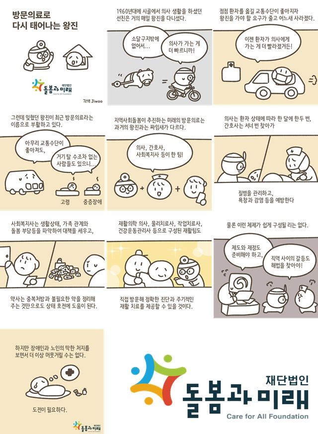 Áö¿ª»çȸ µ¹º½ÀÌ ÃßÁøÇÏ´Â ¹Ì·¡ÀÇ ¹æ¹® ÀÇ·á´Â °ú°ÅÀÇ ¿ÕÁø°ú´Â Â¥ÀÓ»õ°¡ ´Ù¸£´Ù. ÀÇ»ç, °£È£»ç, »çȸº¹Áö»ç°¡ ÆÀÀÌ µÈ´Ù. ÀÇ»ç´Â ȯÀÚ »óÅ¿¡ µû¶ó ÇÑ ´Þ¿¡ ÇѵΠ¹ø, °£È£»ç´Â ¼³Ê ¹ø ã¾Æ°¡ Áúº´À» °ü¸®ÇÏ°í ¿åâ°ú °¨¿°À» ¿¹¹æÇÑ´Ù. »çȸº¹Áö»ç´Â »ýȰ »óÅÂ, °¡Á· °ü°è¿Í µ¹º½ ºÎ´ã µîÀ» ÆÄ¾ÇÇØ ´ëÃ¥À» ¼¼¿öÁØ´Ù. ¿µ¾ç»ç, ÀÓ»ó½É¸®»ç, ÀÇ·á±â»çµéÀÌ °°ÀÌÇÑ´Ù. ¾à»ç°¡ ÇÑ º¸µû¸®¾¿ ÀÖ´Â ¾àÀ» µÚÁ® Áߺ¹ 󹿰ú ºÒÇÊ¿äÇÑ ¾àÀ» Á¤¸®ÇØÁÖ¸é ±×°Í¸¸À¸·Îµµ °Ç°ÀÌ ÁÁ¾ÆÁø´Ù. ³ëÀÎÀ̳ª Àå¾ÖÀÎÀº ±¸° À§»ý »óŰ¡ ³ª»Ú°Å³ª ¾Ã°í »ïŰ´Â ÈûÀÌ ¾àÇØ ¿µ¾ç »óűîÁö ¾ÇÈµÈ ºÐµéÀÌ ¸¹´Ù. ±×·² ¶§´Â Ä¡°úÀÇ»ç¿Í Ä¡À§»ý»ç°¡ ÁýÀ¸·Î °¡¼ ÇØ°áÇØ ÁØ´Ù.