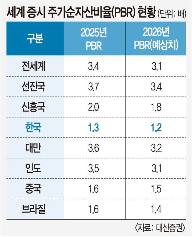 ¿ÃÇØ Àü ¼¼°è Áõ½Ã Æò±Õ PBRÀº 3.4¹è´Ù. ¼±Áø±¹ÀÌ 3.7¹è·Î ¼¼°è Æò±ÕÀ» ¿ôµ¹°í Çѱ¹ÀÌ Æ÷ÇÔµÈ ½ÅÈï±¹ Æò±Õ PBRÀº 2.0¹è´Ù. ½ÅÈï½ÃÀå¿¡ Æ÷ÇÔµÈ ±¹°¡º° PBRÀ» º¸¸é °¡Àå ³ôÀº °÷Àº ´ë¸¸À¸·Î 3.6¹è´Ù. 2À§´Â Àεµ·Î 3.5¹è Á¤µµ´Ù. Áß±¹°ú ºê¶óÁúÀº 1.6¹è·Î ½ÅÈï½ÃÀå Æò±Õº¸´Ù ³·Áö¸¸ ÄÚ½ºÇǺ¸´Ù ³ô´Ù. ¼±Áø±¹¿¡ ¼ÓÇÑ ÀϺ»ÀÇ PBRÀº 1.6¹è, ¹Ì±¹ ½ºÅÄ´õµå¾ØµåǪ¾î½º(S&P) 500Àº 5.2¹è´Ù.