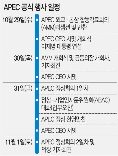 °æÁ¦ÀÎ Çà»çµµ º»°ÝÀûÀ¸·Î ¸·À» ¿¾ú´Ù. ÇÑ¡¤¹Ì Á¤»óÀÌ ¿¬¼³¿¡ ³ª¼± ÃÖ°í°æ¿µÀÚ(CEO) ¼¹Ô °³È¸½ÄÀ» ½ÃÀÛÀ¸·Î ±Û·Î¹ú ±â¾÷ÀεéÀº 31ÀϱîÁö »çÈê°£ 20°³ ¼¼¼Ç¿¡ °ÉÃÄ ´Ù¾çÇÑ ÁÖÁ¦¿¡ ´ëÇØ ÀǰßÀ» ³ª´«´Ù. 31ÀÏ ¿ÀÈÄ¿¡´Â Á¤»ó°ú ±â¾÷ÀÎÀÚ¹®À§¿øÈ¸(ABAC) °£ ¾÷¹« ¿ÀÂùÀÌ ¿¸°´Ù.