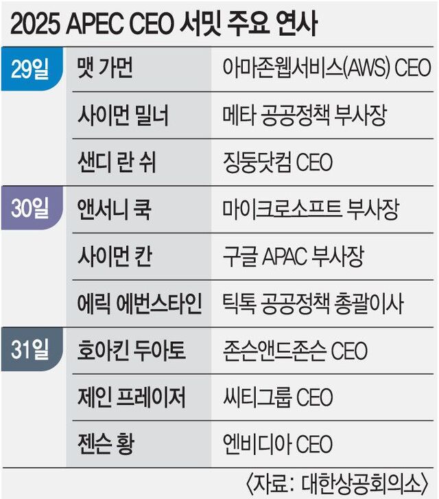 °æºÏ °æÁÖ¿¡¼ 29ÀÏ °ø½Ä °³¸·ÇÑ ¡®2025 ¾Æ½Ã¾ÆÅÂÆò¾ç°æÁ¦Çù·Âü(APEC) CEO ¼¹Ô¡¯Àº Âü¿© Àοø, ¿¬»ç ¼ö, ¼¼¼Ç ½Ã°£ µî ¿©·¯ Ãø¸é¿¡¼ ¿ª´ë ÃÖ´ë ±Ô¸ð·Î Ä¡·¯Áø´Ù. ¡®AI ȲÁ¦¡¯ Á¨½¼ Ȳ ¿£ºñµð¾Æ ÃÖ°í°æ¿µÀÚ(CEO)¸¦ ºñ·ÔÇØ ¿¬´Ü¿¡ ¼´Â ±â¾÷ÀεéÀÇ ¸é¸éµµ È·ÁÇÏ´Ù. ¼¼°è ½ÃÀåÀ» ¿òÁ÷ÀÌ´Â °æÁ¦ ¸®´õµéÀº ¼¹Ô ±â°£ µ¿¾È °¢±¹ °íÀ§±Þ Àλçµé°úµµ ÁýÁßÀûÀ¸·Î ºñÁî´Ï½º ¹ÌÆÃÀ» ÁøÇàÇϸç ÅõÀÚ¡¤Çù·Â È®´ë¸¦ ¸ð»öÇÑ´Ù.
