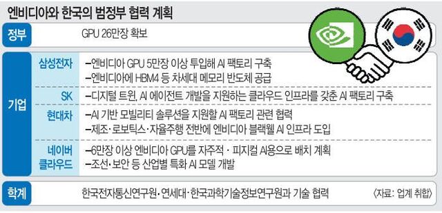 세계 최대 인공지능(AI) 반도체 기업 엔비디아의 젠슨 황 최고경영자(CEO)가 “한국에 그래픽처리장치(GPU) 26만장을 투입해 AI 생태계를 구축하겠다”며 범정부 AI 협력 계획을 발표했다. 정부와 4대 그룹(삼성전자·SK·현대차·네이버클라우드)에 14조원어치의 GPU를 공급하는 초대형 프로젝트다. 이번 사업으로 한국 기업들이 ‘엔비디아 생태계’에 편입되면 한국형 소버린(주권형) AI 구축 계획에 탄력이 붙을 것으로 기대된다.