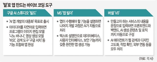 ´À³¦(Vibe)´ë·Î ÄÚµù(Coding)ÇÏ´Â ¡®¹ÙÀ̺ê ÄÚµù¡¯ÀÇ ½Ã´ë°¡ ¼ºÅ ´Ù°¡¿Ô´Ù. ¹ÙÀ̺ê ÄÚµùÀº ÀΰøÁö´É(AI)ÀÇ µµ¿òÀ» ¹Þ¾Æ ÀÏ»ó ¾ð¾î(ÀÚ¿¬¾î)·Î ´ëÈÇϵí Äڵ带 »ý¼ºÇÏ´Â °ÍÀ» ÀǹÌÇÑ´Ù. ¹ö¼¿, ·¯¹öºí°ú °°Àº ½ºÅ¸Æ®¾÷ºÎÅÍ ±Û·Î¹ú ºòÅ×Å©±îÁö ¹ÙÀ̺ê ÄÚµù µµ±¸¸¦ ¾Õ´ÙÅý Ãâ½ÃÇϸç Áï¼®¿¡¼ ¿øÇÏ´Â ´ë·Î ¸¸µé¾î ¾²´Â ¡®ÀÏȸ¿ë ¾Û¡¯ÀÌ º¸Æí鵃 °ÍÀ̶ó´Â Àü¸ÁÀÌ ³ª¿Â´Ù. ±â¾÷ Â÷¿ø¿¡¼µµ ¡®Àü Á÷¿øÀÇ °³¹ßÀÚÈ¡¯¸¦ ²Þ²Ù¸ç °ü·Ã µµ±¸¸¦ Àû±Ø µµÀÔÇÏ´Â Ãß¼¼´Ù.