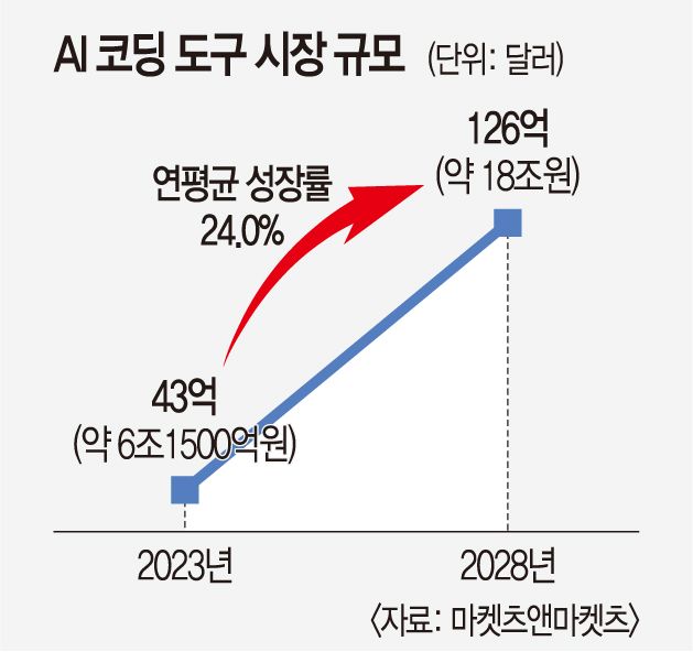 ÀÌ·¯ÇÑ Ãß¼¼¿¡ ÈûÀÔ¾î ÄÚµù ¼ö¿ä´Â Æø¹ßÀûÀ¸·Î Áõ°¡ÇÒ Àü¸ÁÀÌ´Ù. ±Û·Î¹ú ½ÃÀåÁ¶»ç¾÷ü ¸¶ÄÏÃ÷¾Ø¸¶ÄÏÃ÷´Â AI ÄÚµù µµ±¸ ½ÃÀå ±Ô¸ð°¡ 2023³â 43¾ï ´Þ·¯(¾à 6Á¶1500¾ï¿ø)¿¡¼ 2028³â 126¾ï ´Þ·¯(¾à 18Á¶¿ø)·Î ¿¬Æò±Õ 24% ¼ºÀåÇÒ °ÍÀ̶ó°í ¿¹ÃøÇß´Ù.