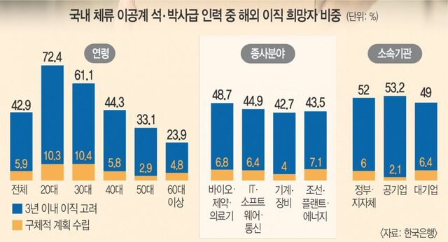 Çѱ¹¿¡¼ ±Ù¹« ÁßÀÎ À̰ø°è ¼®¡¤¹Ú»ç±Þ 2030 Àη 10¸í Áß 7¸íÀÌ ÇâÈÄ 3³â ³» ÇØ¿Ü ÀÌÁ÷À» »ý°¢Çϰí ÀÖ´Â °ÍÀ¸·Î ³ªÅ¸³µ´Ù. ±¹³»¿¡¼± º¸»óÀÌ ¹ÌÈíÇÏ´Ù´Â ÀÎ½Ä Å¿ÀÌ´Ù. Çѱ¹ÀºÇàÀº ¼º°ú ±â¹Ý º¸»ó ü°è¸¦ ¸¶·ÃÇÏ°í ±â¼ú â¾÷À» Áö¿øÇØ Àη À¯ÃâÀ» ¸·À» Çʿ䰡 ÀÖ´Ù°í Á¦¾ÈÇß´Ù.