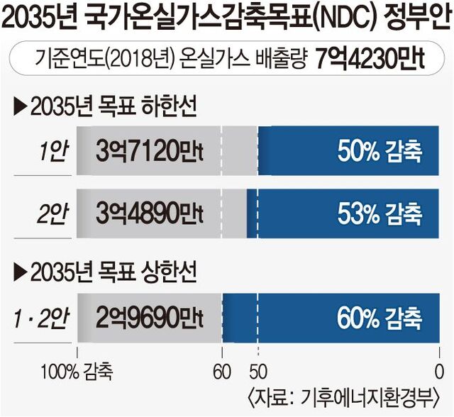 Á¤ºÎ´Â 6ÀÏ ±¹È¸¿¡¼ ¡®2035 NDC °øÃ»È¸¡¯¸¦ ¿°í º¹¼öÀÇ Á¤ºÎ¾ÈÀ» °ø°³Çß´Ù. 1¾ÈÀº 2035³â±îÁö 2018³â ´ëºñ 50% °¨ÃàÀ» ÇÏÇÑÀ¸·Î Çϰí 60% °¨ÃàÀ» »óÇÑÀ¸·Î ÇÑ´Ù. 2¾ÈÀº 1¾È°ú »óÇÑÀº °°À¸³ª ÇÏÇÑÀÌ 53% °¨ÃàÀ¸·Î ´õ ³ô´Ù. Á¤ºÎ¾ÈÀÌ º¹¼ö·Î Á¦½ÃµÈ °ÍÀº óÀ½ÀÌ´Ù. ±è¼ºÈ¯ ±âÈÄ¿¡³ÊÁöȯ°æºÎ Àå°üÀº ¡°Á¤ºÎ´Â »ê¾÷°è¿Í ½Ã¹Î»çȸÀÇ »ó¹ÝµÈ ÀÇ°ß ¼Ó¿¡ ±ÕÇüÁ¡À» ã°íÀÚ ³ë·ÂÇß´Ù¡±°í ¸»Çß´Ù.