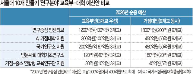 ¡°ÇöÀç °ÅÁ¡±¹¸³´ë 9°÷Àº ´ë¾ÈÀ» ¸¸µé¾î Á¤ºÎ¿Í ±¹È¸¸¦ ¼³µæÇϰí ÀÖ´Ù. ¼¿ï´ë 10°³ ¸¸µé±â Ã¹ÇØ(³»³â)´Â °³º° ´ëÇп¡ µ¹¾Æ°¡´Â ¿¹»êÀ» ÁÙÀÌ´õ¶óµµ 9°÷ÀÌ µ¿½Ã¿¡ Ãâ¹ßÇÏÀÚ´Â ³»¿ëÀÌ´Ù. ±³À°ºÎ´Â ¿¬±¸Á᫐ ´ëÇÐ ÀüȯÀ» À§ÇÑ ¡®¿¬±¸Á᫐ Àμ¾Æ¼ºê¡¯ ¿¹»êÀ¸·Î 1200¾ï¿øÀ» Ã¥Á¤Çϰí 3°³ ´ëÇп¡ 400¾ï¿øÀ» ¹èÁ¤ÇÒ °èȹÀÌ´Ù. ¿ì¸® ¹æ¾ÈÀº ÀÌ ¿¹»êÀ» 1800¾ï¿øÀ¸·Î ´Ã¸®°í 9°³ ´ëÇп¡ 200¾ï¿øÀ» ¹èÁ¤ÇØ´Þ¶ó°í ¿äûÇϰí ÀÖ´Ù(Ç¥ ÂüÁ¶). ³ª´²¸Ô±â¶õ ½Ã°¢µµ ÀÖÁö¸¸ ±×·¸Áö ¾Ê´Ù. ¿ì¸® ¹æ¾ÈÀº 9°³ ´ëÇÐÀÌ µ¿½Ã¿¡ Ãâ¹ßÇÏµÇ Ä¡¿ÇÏ°Ô °æÀïÇϵµ·Ï ÇÏ´Â °ÍÀÌ´Ù. ¿¹ÄÁ´ë Á¤±âÀûÀ¸·Î ¼º°úÆò°¡Çϰí ÇÏÀ§ 3°÷ ¿¹»êÀ» ±ð¾Æ »óÀ§ 3°÷¿¡ ÁÖ´Â ¹æ½ÄÀÌ´Ù. ¿¹»ê ³ª´²¸Ô±â¿Í °Å¸®°¡ ¸Ö´Ù.