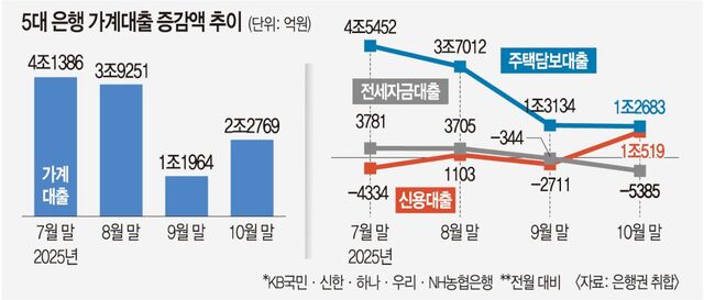 6ÀÏ ±ÝÀ¶±Ç¿¡ µû¸£¸é KB±¹¹Î¡¤½ÅÇÑ¡¤Çϳª¡¤¿ì¸®¡¤NH³óÇù 5´ë ÀºÇàÀÇ 10¿ù ¸» ±âÁØ °¡°è´ëÃâ Àܾ×Àº 766Á¶3718¾ï¿øÀ¸·Î ÇÑ ´Þ »õ 2Á¶2769¾ï¿ø Áõ°¡Çß´Ù. Áö³ 9¿ù Áõ°¨¾×(1Á¶1964¾ï¿ø)ÀÇ µÎ ¹è´Ù. ÃÖ±Ù °¨¼Ò Ãß¼¼¿´´ø °¡°è´ëÃâ Àܾ×ÀÌ ¹ÝµîÇÑ °ÍÀº ½Å¿ë´ëÃâ ¶§¹®ÀÌ´Ù. ½Å¿ë´ëÃâ Àܾ×Àº 1Á¶519¾ï¿øÀÌ Áõ°¡Çß´Ù. Áö³ 8¿ù¿¡´Â Áõ°¡ ÆøÀÌ 1103¾ï¿ø¿¡ ºÒ°úÇß°í 9¿ù¿¡´Â 2711¾ï¿ø °¨¼ÒÇß´Ù.