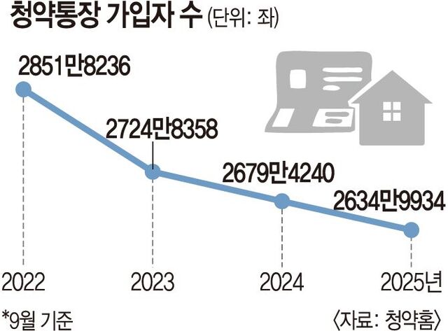 9ÀÏ Çѱ¹ºÎµ¿»ê¿ø û¾àȨ¿¡ µû¸£¸é Áö³ 9¿ù ±âÁØ Ã»¾àÅëÀå(ÁÖÅÃû¾àÁ¾ÇÕÀúÃࡤû¾àÀúÃࡤû¾àºÎ±Ý¡¤Ã»¾à¿¹±Ý Æ÷ÇÔ) °¡ÀÔÀÚ´Â 2634¸¸9934¸íÀ» ±â·ÏÇß´Ù. ¿ÃÇØ µé¾î °¡Àå ÀûÀº ¼öÄ¡´Ù. Áö³ 1¿ù 2644¸¸1690¸íÀÌ´ø û¾àÅëÀå °¡ÀÔÀÚ°¡ 8°³¿ù »õ 9¸¸1756¸í ÁÙ¾ú´Ù. 2022³â 6¿ù ´ëºñ Áö³ 9¿ù±îÁö 3³â3°³¿ù°£ 224¸¸9345¸í ÁÙ¾ú´Ù.