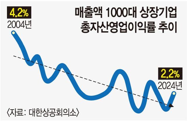 ´ëÇÑ»ó°øÈ¸ÀǼҴ 10ÀÏ ¡®¸ÅÃâ¾× 1000´ë ±â¾÷ÀÇ 20³â ¼öÀͼº ÃßÀÌ¿Í ½Ã»çÁ¡¡¯ º¸°í¼¿¡¼ ¸ÅÃâ¾× »óÀ§ 1000°³ ±â¾÷ÀÇ ÃÑÀڻ꿵¾÷ÀÌÀÍ·ü(ROA)ÀÌ 2004³â 4.2%¿¡¼ Áö³ÇØ 2.2%·Î °¨¼ÒÇß´Ù°í ¹àÇû´Ù. 20³â Àü¿¡´Â ÀÚ»ê 1¾ï¿øÀ¸·Î ¿¬°£ 420¸¸¿øÀ» ¹ú¾ú´Ù¸é Áö±ÝÀº 220¸¸¿ø¹Û¿¡ ³²±âÁö ¸øÇÑ´Ù´Â Àǹ̴Ù.