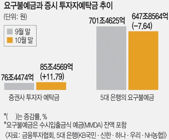 10ÀÏ ±ÝÀ¶ÅõÀÚÇùȸ¿¡ µû¸£¸é Áõ½Ã ´ë±â ÀÚ±ÝÀ¸·Î ºÐ·ùµÇ´Â ÅõÀÚÀÚ¿¹Å¹±ÝÀº Áö³´Þ ¸» ±âÁØ 85Á¶4569¾ï¿øÀ¸·Î ¿ª´ë ÃÖ´ëÄ¡¸¦ ±â·ÏÇß´Ù. Áö³ 1¿ù ¸»(55Á¶5786¾ï¿ø) ´ëºñ 53.76%, Áö³ 9¿ù ¸»(76Á¶4474¾ï¿ø)º¸´Ù´Â 11.79% Áõ°¡ÇÑ ¼öÄ¡´Ù. Åë»ó ÅõÀÚÀÚ¿¹Å¹±ÝÀº ÁÖ°¡ »ó½Â ±â´ë¿¡ ºñ·ÊÇØ Áõ°¡ÇÏ´Â °æÇâÀÌ ÀÖ´Ù.