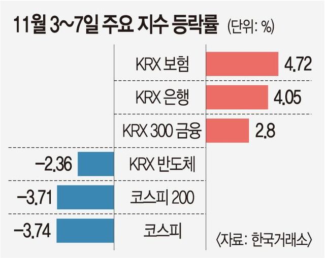 10ÀÏ Çѱ¹°Å·¡¼Ò¿¡ µû¸£¸é À̳¯ KB±ÝÀ¶Àº Àü °Å·¡ÀÏ ´ëºñ 5300¿ø(4.28%) ¿À¸¥ 12¸¸9000¿øÀ¸·Î ÀåÀ» ¸¶°¨ÇØ 52ÁÖ ½Å°í°¡ ±â·ÏÀ» °¥¾ÆÄ¡¿ü´Ù. iM±ÝÀ¶ÁöÁÖ(4.88%)¿Í »ï¼º»ý¸í(4.54%), Çϳª±ÝÀ¶ÁöÁÖ(4.57%), ¸Þ¸®Ã÷±ÝÀ¶ÁöÁÖ(2.6%) µî ´Ù¸¥ ÀºÇࡤº¸ÇèÁÖµµ ÀÏÁ¦È÷ °¼¼¸¦ º¸¿´´Ù. ÄÚ½ºÇǰ¡ 3.74% Ç϶ôÇÑ Áö³ÁÖ(3~7ÀÏ)¿¡µµ KRX ÀºÇà Áö¼ö´Â 4.05%, KRX º¸Çè Áö¼ö´Â 4.72% »ó½ÂÇß´Ù. Á÷Àü ÁÖ(10¿ù 31ÀÏ~11¿ù 6ÀÏ)¸¦ º¸´õ¶óµµ KRX ÀºÇà Áö¼ö´Â 6.14% »ó½ÂÇØ ÁÖ°£ »ó½Â·ü 1À§¸¦ Â÷ÁöÇß´Ù.