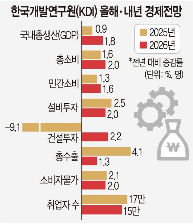 ±¹Ã¥¿¬±¸±â°üÀÎ Çѱ¹°³¹ß¿¬±¸¿ø(KDI)ÀÌ ¿ÃÇØ Çѱ¹ÀÇ °æÁ¦¼ºÀå·ü Àü¸ÁÄ¡¸¦ 3°³¿ù Àüº¸´Ù 0.1% Æ÷ÀÎÆ® ³ôÀÎ 0.9%·Î Á¦½ÃÇß´Ù. 3ºÐ±â ±¹³»ÃÑ»ý»ê(GDP)ÀÌ 1.2% ±ô¦ ¼ºÀåÀ» ±â·ÏÇÏ¸ç ¡®¿¬°£ 1% ¼ºÀ塯 ±â´ë°¨ÀÌ ÆÛÁö´Â »óȲ¿¡¼ ´Ù¼Ò º¸¼öÀû ±âÁ¶¸¦ À¯ÁöÇß´Ù. ³»³â ¼ºÀå·üÀº 0.2% Æ÷ÀÎÆ® ³ôÀÎ 1.8%·Î Àü¸ÁÇß´Ù. ¾Æ¿ï·¯ ÇâÈÄ °æ±â ȸº¹¼¼¿¡ ¸ÂÃç È®Àå ÀçÁ¤ÀÇ ¡®Á¤»óÈ¡¯ Çʿ伺À» ¾ð±ÞÇß´Ù.