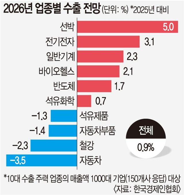 Çѱ¹°æÁ¦ÀÎÇùȸ(ÇѰæÇù)´Â ½ÃÀåÁ¶»ç Àü¹®±â°ü ¸ð³ë¸®¼Ä¡¿¡ ÀÇ·ÚÇØ ¸ÅÃâ¾× ±âÁØ 1000´ë ±â¾÷ Áß 10´ë ¼öÃâ ÁÖ·Â ¾÷Á¾À» ´ë»óÀ¸·Î ¡®2026³â ¼öÃâ Àü¸Á Á¶»ç¡¯¸¦ ÁøÇàÇÑ °á°ú ³»³âµµ ¼öÃâÀÌ ¿ÃÇØ ´ëºñ 0.9% Áõ°¡¿¡ ±×Ä¥ °ÍÀ¸·Î ³ªÅ¸³µ´Ù°í 11ÀÏ ¹àÇû´Ù. ÀÌ´Â ¿ÃÇØ 1~10¿ù ¼öÃâÁõ°¡À²ÀÎ 2.3% ´ëºñ Àý¹Ý ³Ñ°Ô ÁÙ¾îµç ¼öÄ¡´Ù.