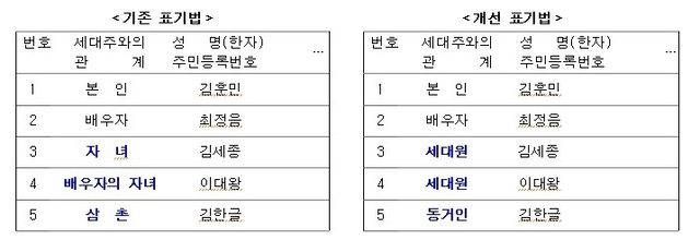 °³Á¤¾ÈÀ» º¸¸é Áֹεî·Ï µî¡¤Ãʺ»¿¡¼ °³ÀÎÁ¤º¸ ³ëÃâÀ» ÃÖ¼ÒÈÇß´Ù. ¼¼´ëÁÖÀÇ ¹è¿ìÀÚ ¿Ü °¡Á·(ºÎ¸ð, Á¶ºÎ¸ð, ÇüÁ¦Àڸеî)Àº ¡®¼¼´ë¿ø¡¯, ±× ¿Ü¿¡´Â ¡®µ¿°ÅÀΡ¯À¸·Î Ç¥±âµÈ´Ù. ¿¹ÄÁ´ë ÀçÈ¥ÇÑ A¾¾°¡ ÀÚ³àÀÇ Çб³ Á¦Ãâ¿ë µîº»À» ¹ß±Þ¹ÞÀ» ¶§ ±âÁ¸¿¡´Â ¾ÆÀ̰¡ ¡®¹è¿ìÀÚÀÇ Àڳ࡯·Î Ç¥½ÃµÅ ÀçÈ¥ »ç½ÇÀÌ µå·¯³¯ ¼ö ÀÖ¾úÀ¸³ª ¾ÕÀ¸·Î´Â ´Ü¼øÈ÷ ¡®¼¼´ë¿ø¡¯À¸·Î ±âÀçµÈ´Ù.
