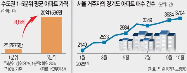 °í°¡¿Í Àú°¡ ¾ÆÆÄÆ®ÀÇ °¡°Ý °ÝÂ÷°¡ Ä¿Áö¸é¼ ¼¿ï ¾ÆÆÄÆ®ÀÇ 5ºÐÀ§ ¹èÀ²(»óÀ§ 20%¸¦ ÇÏÀ§ 20%·Î ³ª´« °ª)Àº 6.8À» ±â·ÏÇß´Ù. °ü·Ã Åë°è°¡ ÀÛ¼ºµÈ ÀÌÈÄ ÃÖ°íÄ¡´Ù. ¼öµµ±Ç ¾ÆÆÄÆ® °£ °¡°Ý °ÝÂ÷´Â ´õ ÄÇ´Ù. 10¿ù ¼öµµ±Ç ¾ÆÆÄÆ®ÀÇ 5ºÐÀ§ Æò±Õ °¡°ÝÀº 20¾ï1596¸¸¿øÀÎ ¹Ý¸é, 1ºÐÀ§´Â 2¾ï2976¸¸¿øÀ¸·Î ±× °ÝÂ÷°¡ 8.8¹è¿¡ ´ÞÇß´Ù. Áö³´Þ ±âÁØ ¼¿ïÀÇ Æò±Õ ¾ÆÆÄÆ® °¡°ÝÀº 14¾ï6000¿©¸¸¿ø, °æ±â´Â 5¾ï7000¿©¸¸¿øÀ̾ú´Ù.
