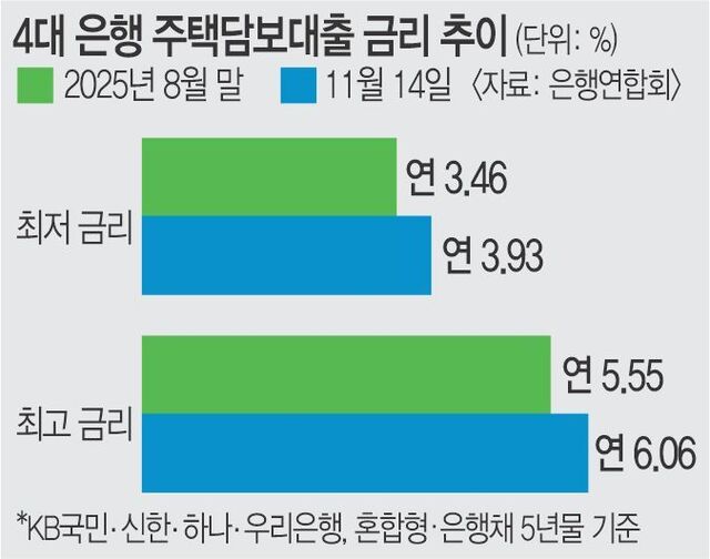 ±ÝÀ¶ ´ç±¹ °³ÀÔ¿¡ ÁÖ´ã´ë ±Ý¸®¿Í ±âÁرݸ® °£ Â÷À̵µ ¹ú¾îÁö°í ÀÖ´Ù. KB±¹¹Î¡¤½ÅÇÑ¡¤Çϳª¡¤¿ì¸® 4´ë ÀºÇàÀÇ Áö³ 14ÀÏ ±âÁØ È¥ÇÕÇü(5³â °íÁ¤) ÁÖ´ã´ë ±Ý¸®´Â ¿¬ 3.93~6.06%´Ù. 4´ë ÀºÇàÀÇ È¥ÇÕÇü ÁÖ´ã´ë ÃÖ°í ±Ý¸®°¡ ¿¬ 6% ¼±À» ³Ñ±ä °ÍÀº 2023³â 12¿ù ÀÌÈÄ ¾à 2³â ¸¸ÀÌ´Ù. ´ç½Ã ±âÁرݸ®´Â 3.5%·Î Áö±Ýº¸´Ù 1% Æ÷ÀÎÆ® ³ô¾Ò´Ù. ´Ù¸¸ ÀÌ´Â Ãֱ٠ȥÇÕÇü ÁÖ´ã´ëÀÇ ÁöÇ¥ÀÎ ÀºÇàä ±Ý¸®°¡ ¶Ú Å¿µµ ÀÖ´Ù. ÃÖ±Ù Çѱ¹ÀºÇà°ú ¹Ì±¹ ¿¬¹æÁغñÁ¦µµ(Fed)°¡ ±âÁرݸ®¸¦ ´õ ³·ÃßÁö ¾ÊÀ» ¼ö ÀÖ´Ù´Â °üÃøÀÌ È®»êÇÏ¸é¼ ÀºÇà並 ºñ·ÔÇÑ ½ÃÀå ±Ý¸®°¡ »ó½ÂÇÏ´Â Ãß¼¼´Ù.
