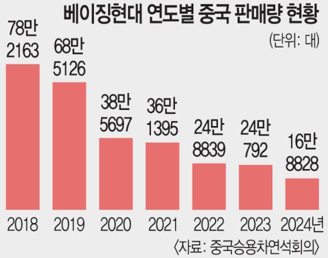 Çö´ëÂ÷´Â ±×µ¿¾È Áß±¹ ½ÃÀå¿¡¼ °íÀüÀ» ¸éÄ¡ ¸øÇß¾ú´Ù. ¹Ì±¹ À¯·´ ¾Æ½Ã¾Æ¿¡¼ ¼±ÀüÇÏ¸ç ¿Ï¼ºÂ÷±×·ì ¼¼°è 3À§¶ó´Â ¼º°ú¸¦ À̾°í ÀÖÁö¸¸ À¯µ¶ Áß±¹Àº ³°øºÒ¶ôÀ̾ú´Ù. 2017³â »çµå(THAAD¡¤°í°íµµ¹Ì»çÀϹæ¾îü°è) »çÅ·ΠÃ˹ßÇÑ ÇÑ¡¤Áß °ü°è ¾ÇȰ¡ °è±â¿´´Ù. º£ÀÌ¡Çö´ë´Â 2018³â 78¸¸2163´ë¸¦ ÆÇ¸ÅÇÑ ÀÌÈÄ 2019³â 68¸¸5126´ë, 2020³â 38¸¸5697´ë, 2021³â 36¸¸1395´ë, 2022³â 24¸¸8839´ë, 2023³â 24¸¸792´ë, Áö³ÇØ 16¸¸8828´ë·Î ³»¸®¸·±æÀ» °É¾î¿Ô´Ù.